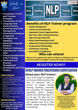 | Online - Zoom | November 25, 2025 - January 4, 2026 | NLP Basic Practitioner Certification Workshop |